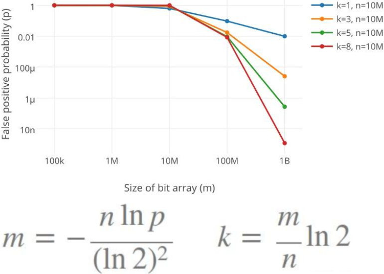 k:哈希函数个数 m:布隆过滤器长度 n:插入的元素个数 p:误报率