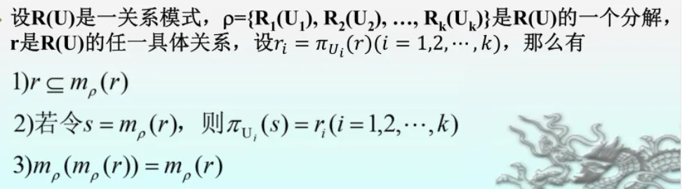 - 实际上,关系模式的分解,不仅仅是属性集合的分解,它是对关系模式上的函数依赖集,以及关系模式对应的具体关系进行分解的体现。