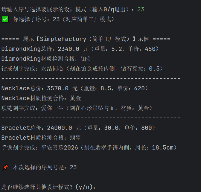 user_choice = input("\n是否继续选择其他设计模式?(y/n):").strip().lower()