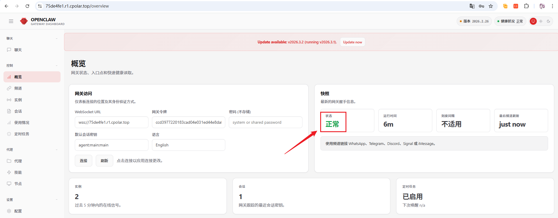 这样,openclaw就成功通过cpolar穿透至公网了,即使出门在外,只要有网络,就可以随时随地访问你部署在家中的openclaw了。