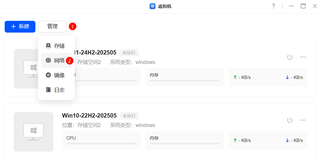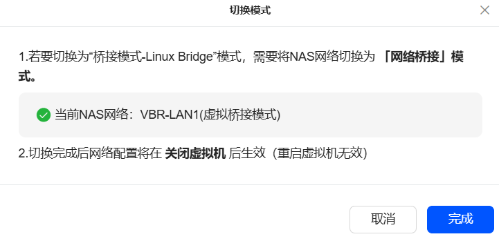 随后打开虚拟机应用,管理 → 网络。将模式选择为 桥接模式-LinuxBridge