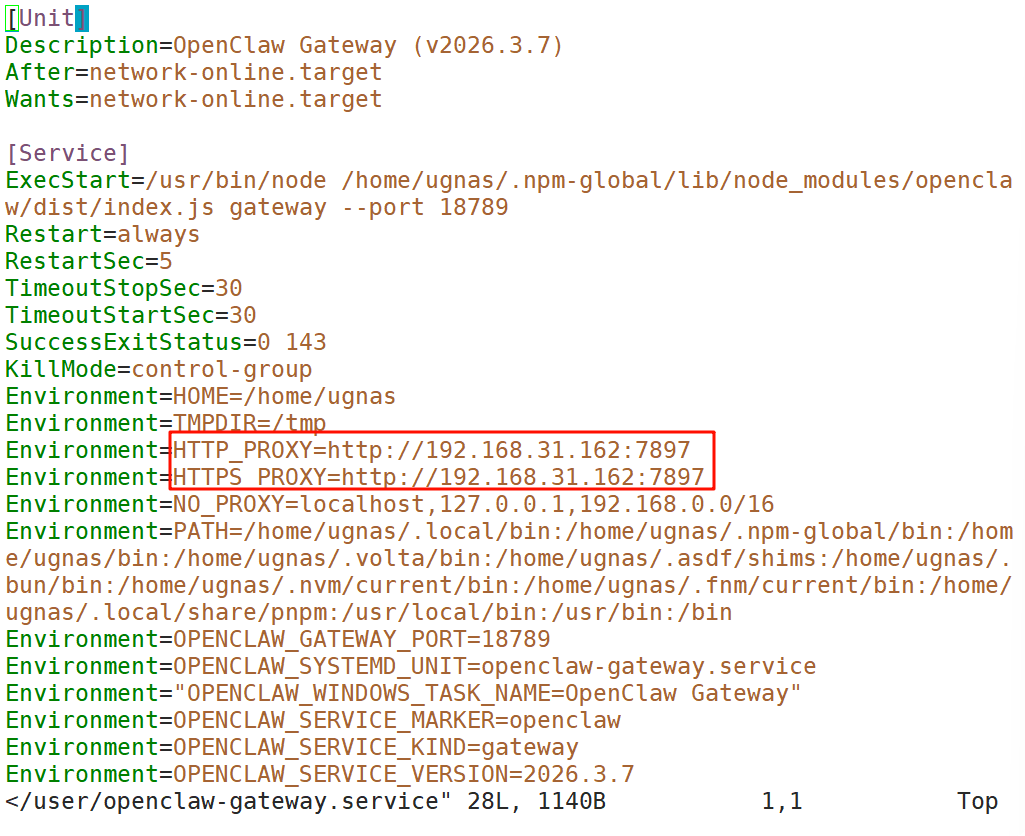 编辑 OpenClaw 网关配置文件,将 Environment 的 HTTP_PROXY和HTTPS_PROXY都改为前面代理的端口