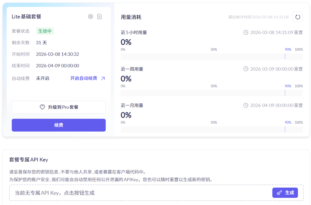 这里购买了阿里云的Coding Plan Lite,建议实际使用以月套餐的大模型为主,避免按Token计费的(因为消耗巨大)