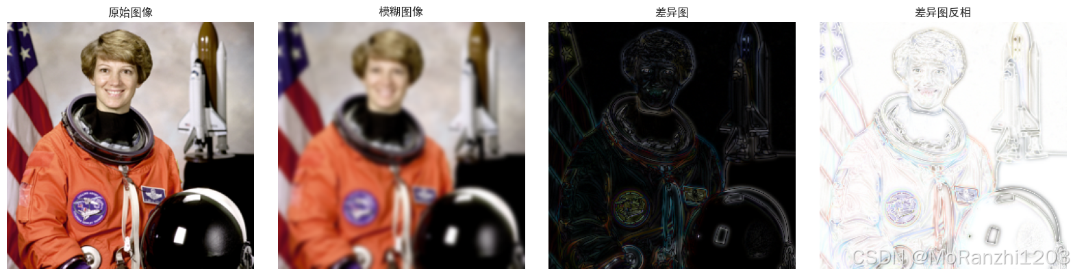 下面给出一个更完整的示例,将模糊、差异运算与反相组合起来,用于观察图像处理前后的变化: