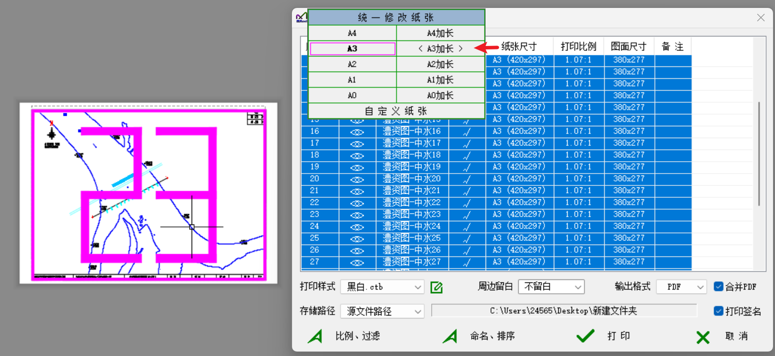 4、点击列表头 <纸张尺寸>、<打印比例>可快速对所有图纸统一修改纸张、打印比例。