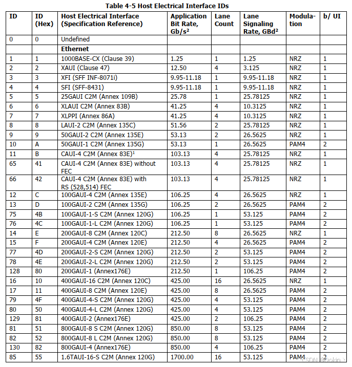 APP宣称的第一个Byte:Host Interface ID,在SFF-8024定义,详见Table 4-5(仅截取部分)。根据这些ID可确定Host侧的传输速率以及编码方式等。