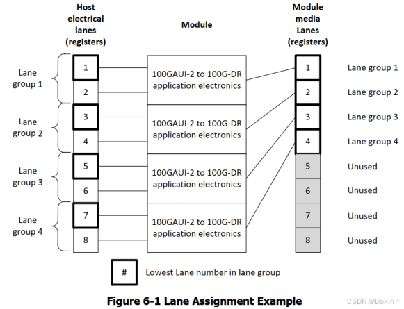例如对于400G DR4模块,其宣称400G DR4应用时,其使用到的电通道数为8,光通道数为4,具体写值转换成二进制:0000b-由接口ID定义通道数;0001b-1个通道;0010b-2个通道...1000b-8个通道。