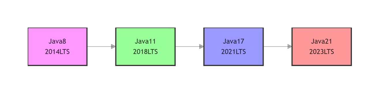 推荐采用分阶段升级的方式,降低升级风险,不建议直接从Java 8一步升级到Java 21,推荐升级路径: