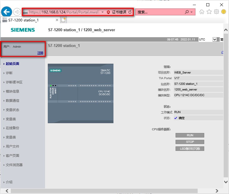 - 在浏览器中安装证书之后,再以 https://192.168.0.124 访问 Web 服务器时就不会再出现安全验证提示,可以直接跳转到 S7-1200 的 Web 服务器页面。