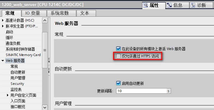 - 要使用 HTTP 访问 Web 服务器,需要保证在组态 1200Web 服务器时,取消勾选仅允许通过 HTTPS 访问,如图 1 所示。