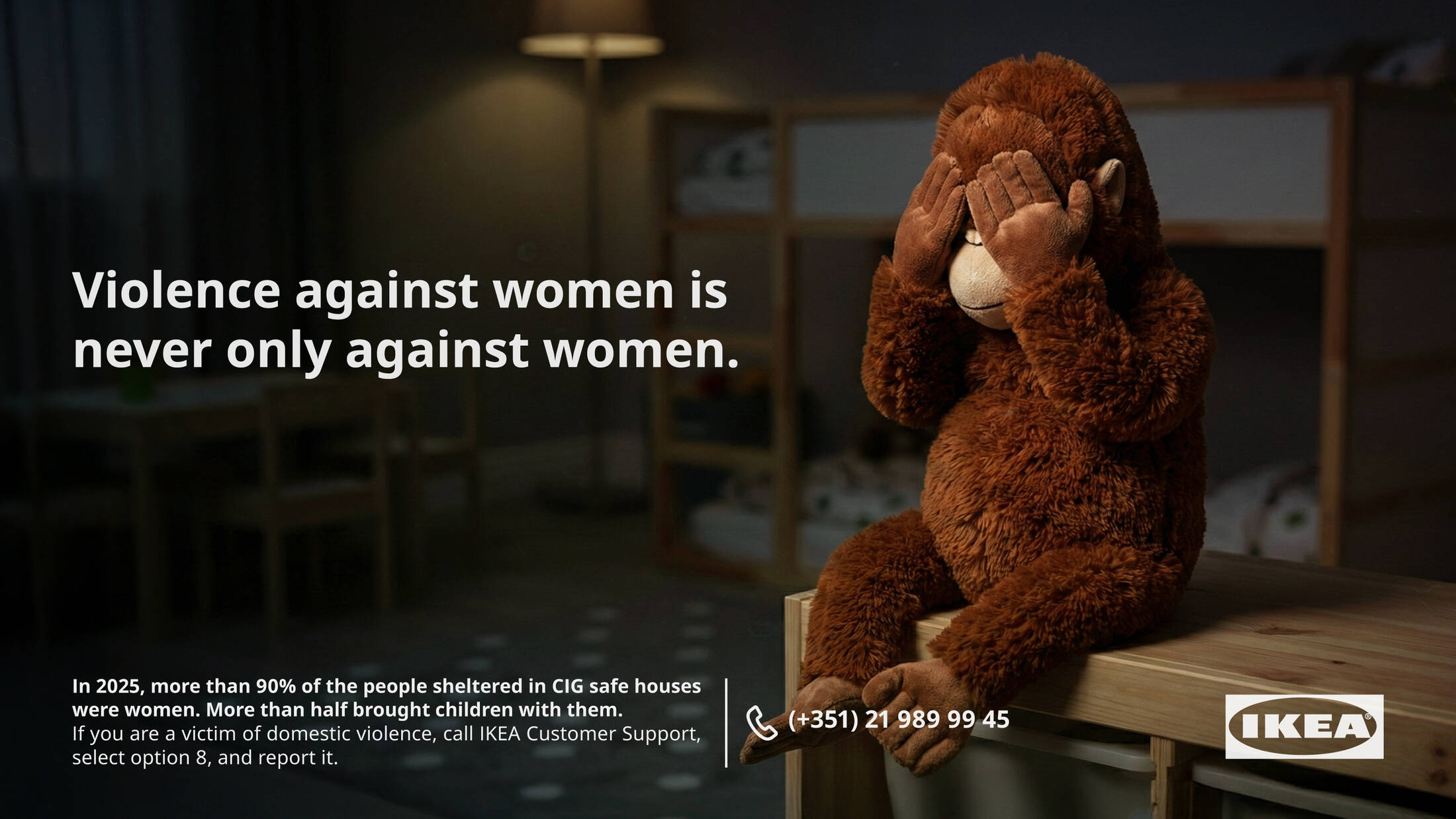 在过去一年里,宜家葡萄牙接到的电话数量比 2024 年多了两倍多。绝大多数受害者是女性。但针对女性的暴力行为绝不仅仅影响女性本人。它还会影响到她们身边的所有人------尤其是孩子。事实上,根据 CIG 最新的报告,超过半数被安置在庇护所的女性是带着孩子来的。