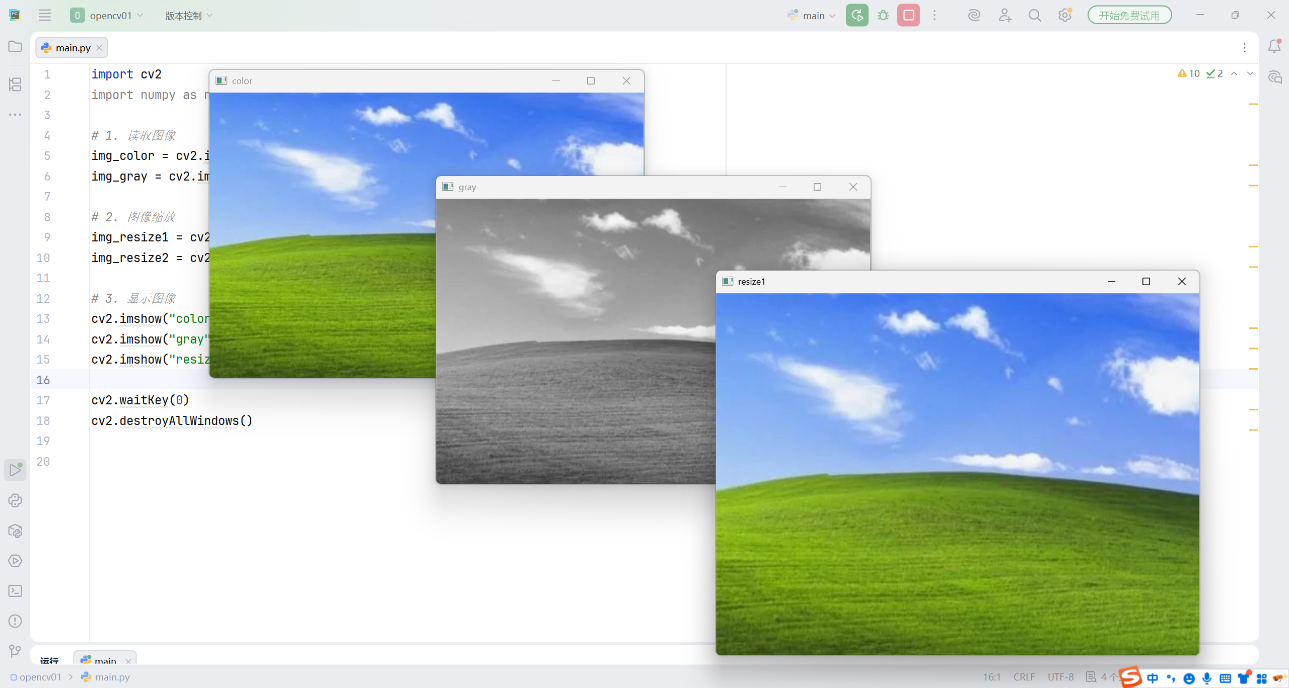 其中imshow()创建显示窗口,waitKey(0)表示等待按键输入,0表示一直等待,destroyAllWindows()关闭所有窗口