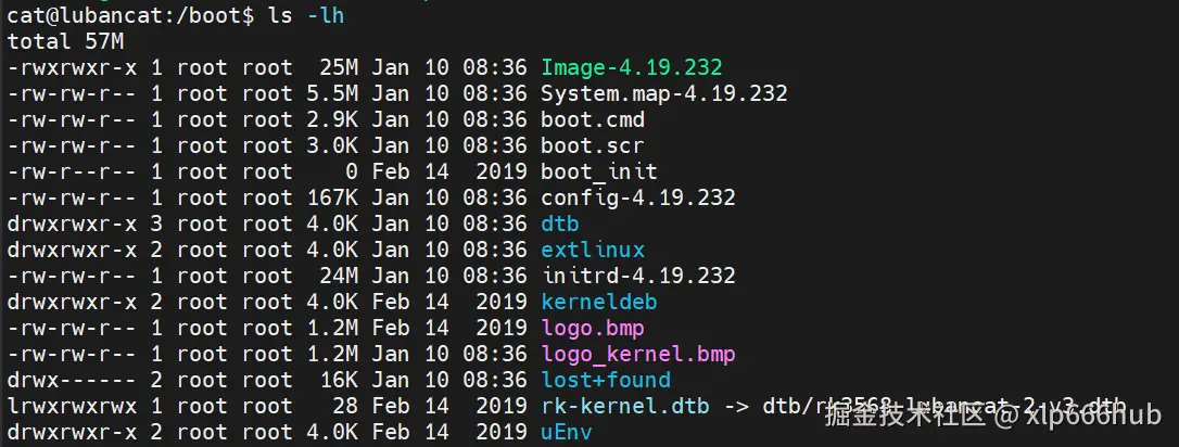Image-4.19.232是 Linux 内核镜像,它后面要被 U-Boot 加载到内存里面。rk-kernel.dtb是一个软链接,它指向 U-Boot 真正会加载到内存里面的dtb文件,前面我说过,我通常会把编译好的dtb文件拷贝到板子的/boot/dtb目录下,众所周知同一目录下不能出现两个文件名相同的文件,所以这个新编译好的dtb文件就会覆盖掉旧的dtb文件,从而在启动阶段被 U-Boot 加载到内存。dtb/是存放二进制设备树文件的目录,包含多个板型的设备树文件,根据rk-kernel.dtb这个软链接的指向,决定 U-Boot 会加载哪个dtb文件。这也是这里软链接设计的精妙之处,有了这个软链接,我们完全可以将rk-kernel.dtb这个软链接名硬编码进 U-Boot ,这样只需要改变这个软链接的指向就可以切换 U-Boot 加载的设备树,而不需要修改 U-Boot 并编译那么麻烦。boot.cmd是 U-Boot 脚本源文件,也就是启动流程的源代码,我们后面会分析它。boot.scr是boot.cmd编译后的文件,U-Boot 实际加载的就是它。initrd-4.19.232是初始内存文件系统,是一个临时的根文件系统。