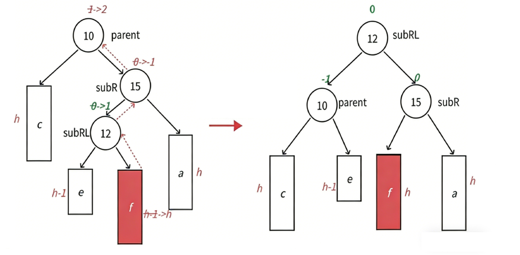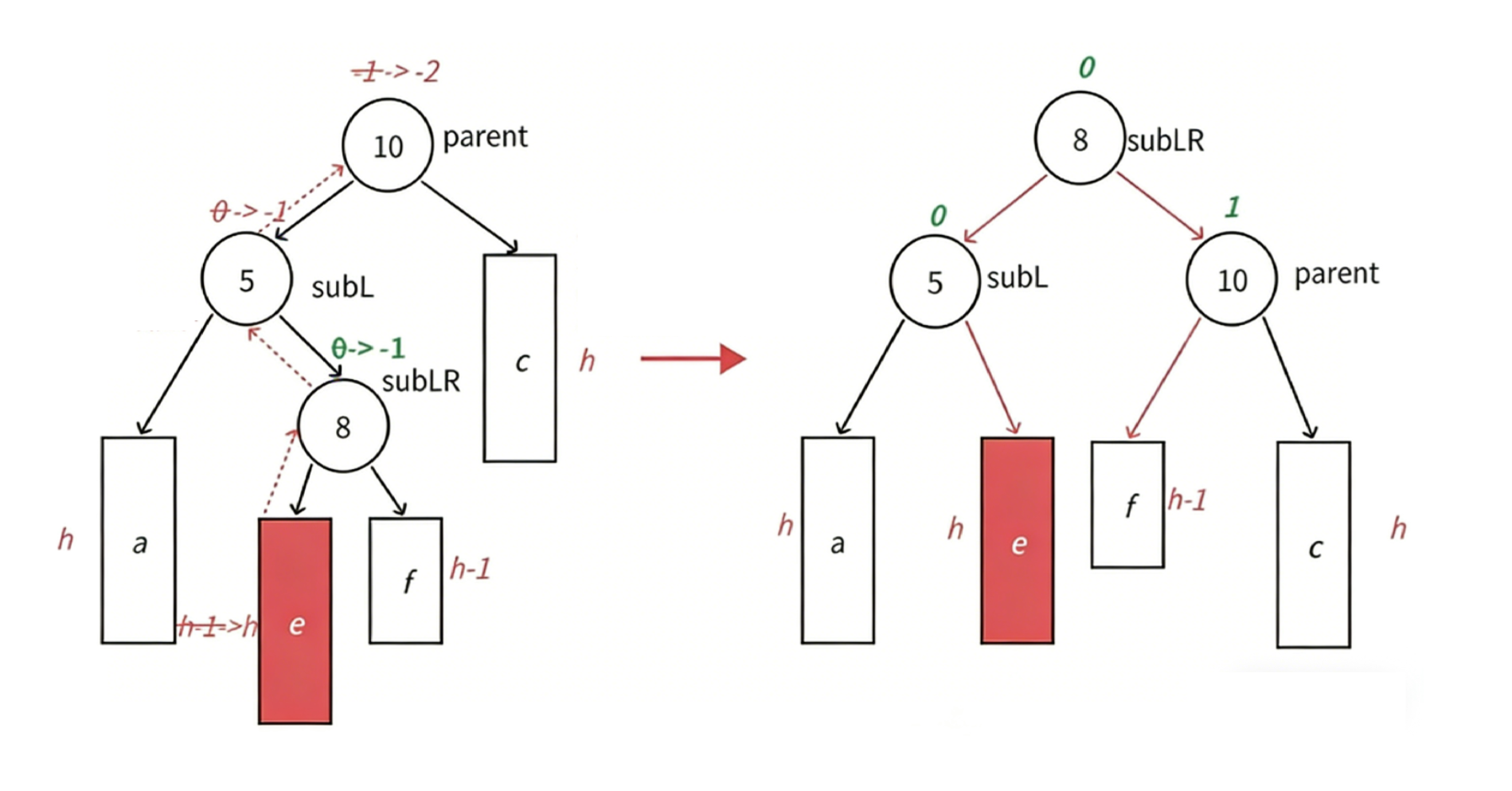 调整后,搜索树仍符合 a < 5 < b < 10 < c 的规则,结构保持完整。旋转操作使得节点 5 和 10 的平衡因子恢复为 0,局部子树的高度恢复至插入前的 h+2 层。这意味着该子树对外部父节点的高度影响与插入前完全一致