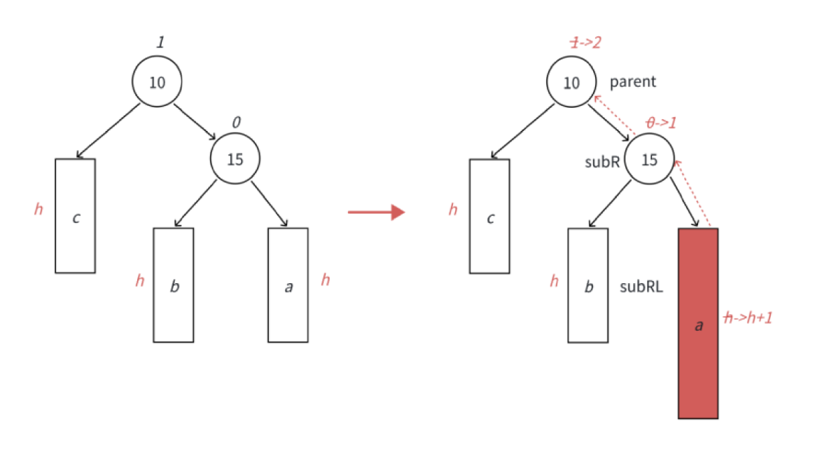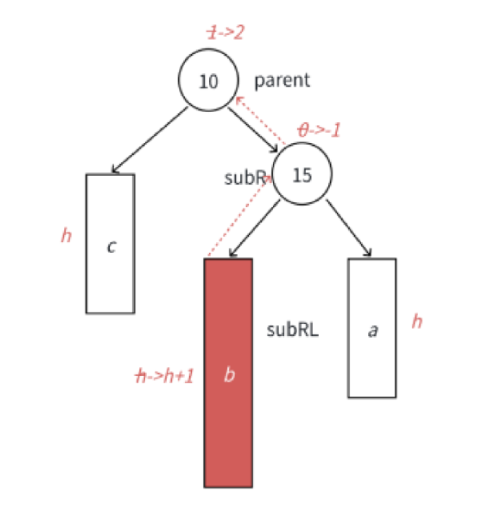 当我们在子树 a 中插入一个新节点,导致 a 的高度从 h 增加到 h+1,从而使节点 5 的平衡因子变为 -1,而根节点 10 的平衡因子从 -1 变为 -2。此时,以 10 为根的子树违反了平衡规则,且重心明显偏向左侧