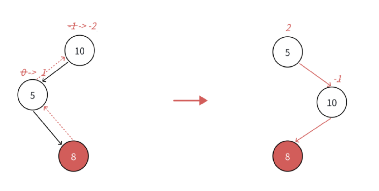 为了重新平衡,我们需要将 10 所在的轴线向右压下去。基于 5 < b < 10 的大小关系,旋转步骤如下: