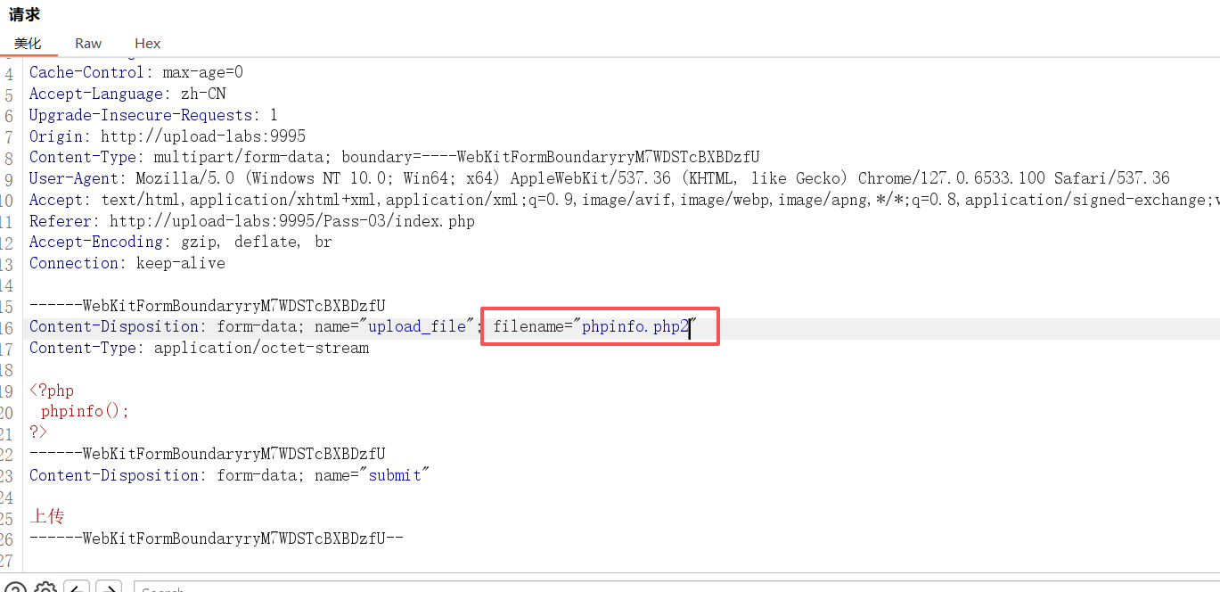 我们上传一个合法文件绕过客户端检查,burpsuite拦截数据包修改文件名为.php后缀。由于服务器后端没有二次验证,就会直接上传成功