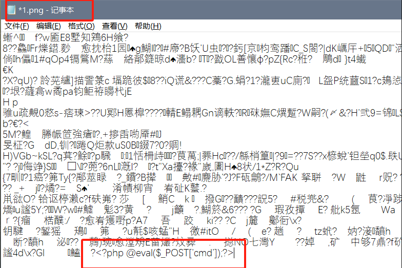文本方式打开图片直接粘贴一句话木马:将一个图片以文本格式打开(这里用的记事本方式打开修改,不过修改后图片无法正常显示了),后面粘贴上一句话木马