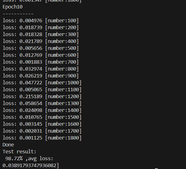 我们运行代码后,经过 10 轮训练,最终得到了98.72% 的测试集准确率,平均损失仅 0.0419,这个结果对于入门级 CNN 模型来说,已经非常优秀。