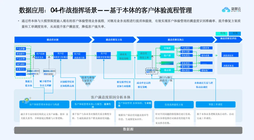 - 满意度分析与修复:通过模型分析客户满意度,针对低满意度问题生成修复工单,由市场、售后等部门落地修复动作;