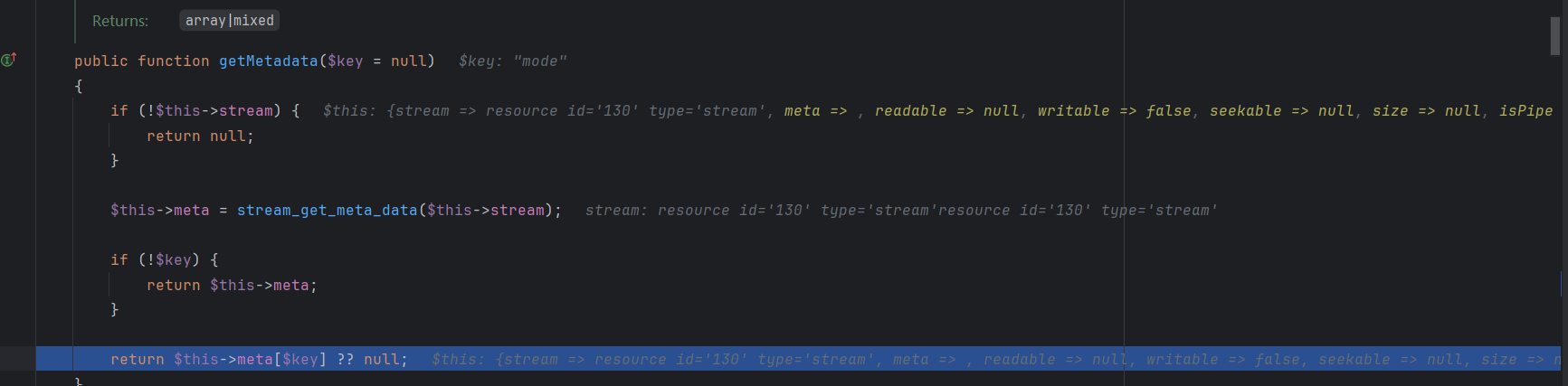 · 含义:流的元数据,通过 stream_get_meta_data($this->stream) 获得。它包含流的信息,如模式、是否阻塞、超时设置、包装器类型等。延迟加载,首次调用 getMetadata() 时填充。