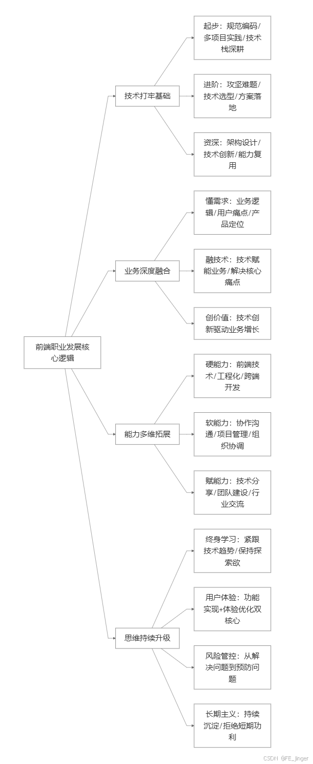 作为前端开发者,在技术快速迭代、业务场景不断丰富的行业环境中,找到清晰的职业发展路径,实现从新手到资深工程师的进阶,是我们持续探索的课题。近期研读了京东两位前端前辈赵姣姣、付小波的成长分享,一位从校招新星一路成长为前端技术专家,深耕广告业务实现技术与业务的双重突破;一位完成从C端到B端的技术转型,在复杂业务体系中沉淀出高效的研发方法论。两位前辈的实战经验,为我们梳理出了前端职业发展的核心逻辑:技术打牢基础、业务深度融合、能力多维拓展、思维持续升级。结合这些宝贵经验,我也对自身前端职业发展做出了清晰规划,希望能与同行者共勉。