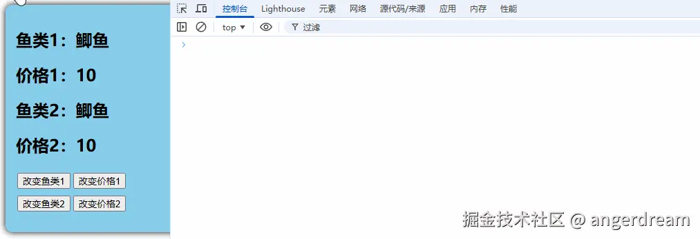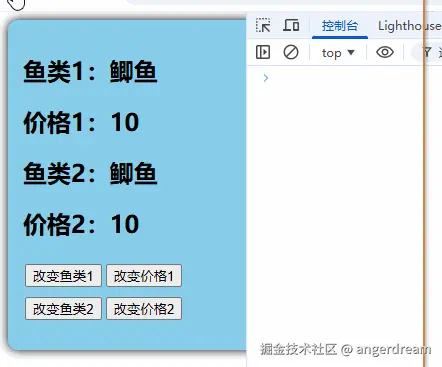 运行点击改变鱼类1 与改变价格1 按钮,页面中只有鱼类1、价格1做响应变化。点击改变鱼类2 与改变价格2页面无任何变化。
