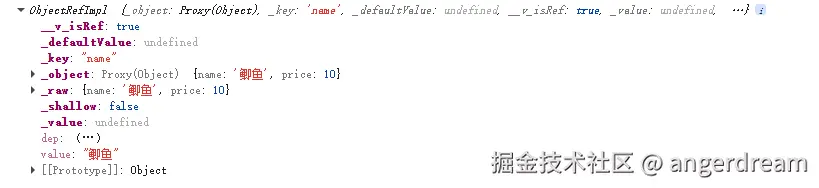 我们看看,fish下的name与price都变成ref定义的数据。回头再来看看官网说明,是否都明白了。 将一个响应式对象转换为一个普通对象,这个普通对象的每个属性都是指向源对象响应属性的ref。每个单独的ref都是使用toRef创建的。