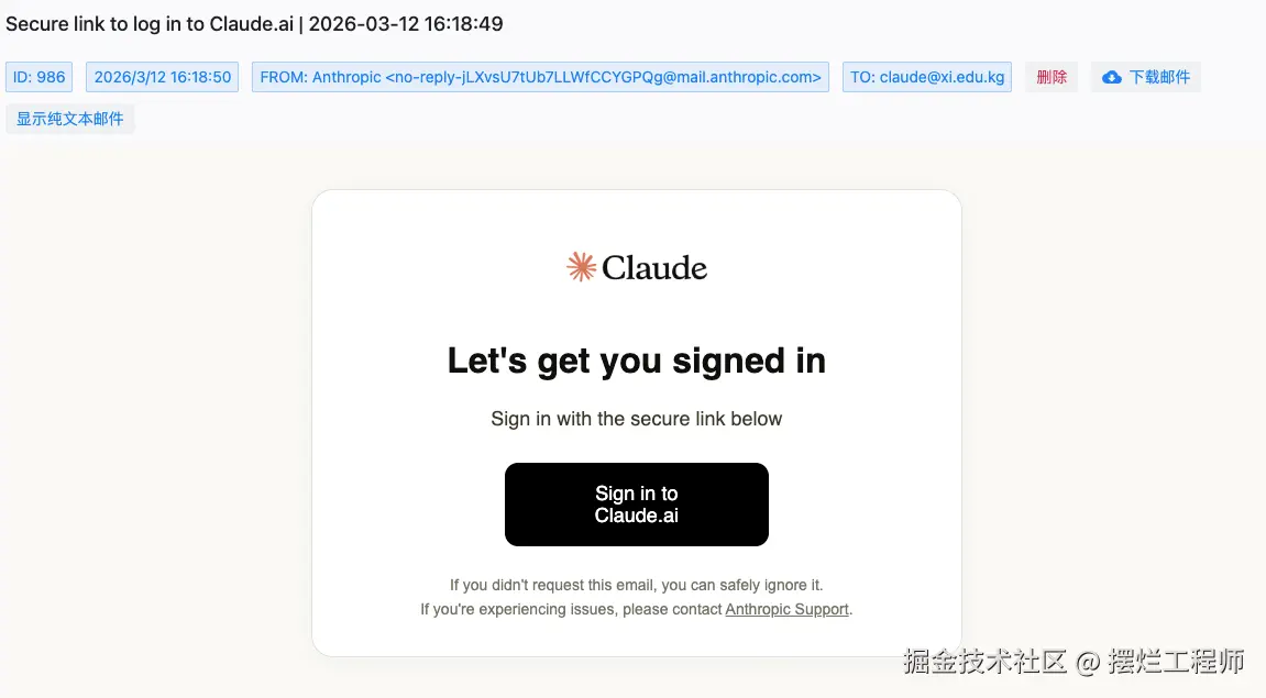没有的话,直接输入你的邮箱,点 "Continue with email" 之后,不需要等待,直接去你的邮箱查看 Claude 邮件。