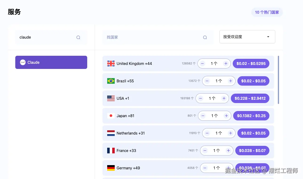现在可以用的是这个 hero-sms 接码平台申请一个国外手机号。可以根据业务选择号码,你搜索 Claude 就可以拿到号码后填进去,点 "Send Verification Code" 发送验证码。