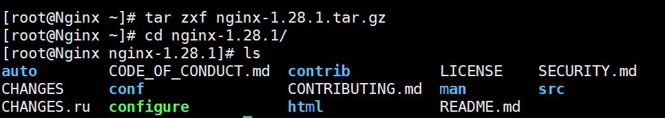 root@Nginx \~\]# tar zxf nginx-1.28.1.tar.gz \[root@Nginx \~\]# cd nginx-1.28.1/ \[root@Nginx nginx-1.28.1\]# ls