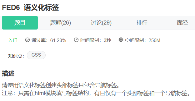 <header>:HTML5 官方语义化头部标签,用于定义页面或内容区块的头部区域,是题目要求的「头部标签」的标准实现,替代传统无意义的<div class="header">非语义写法。<nav>:HTML5 官方语义化导航标签,专门用于包裹页面的主导航内容,是题目要求的「导航标签」的标准实现