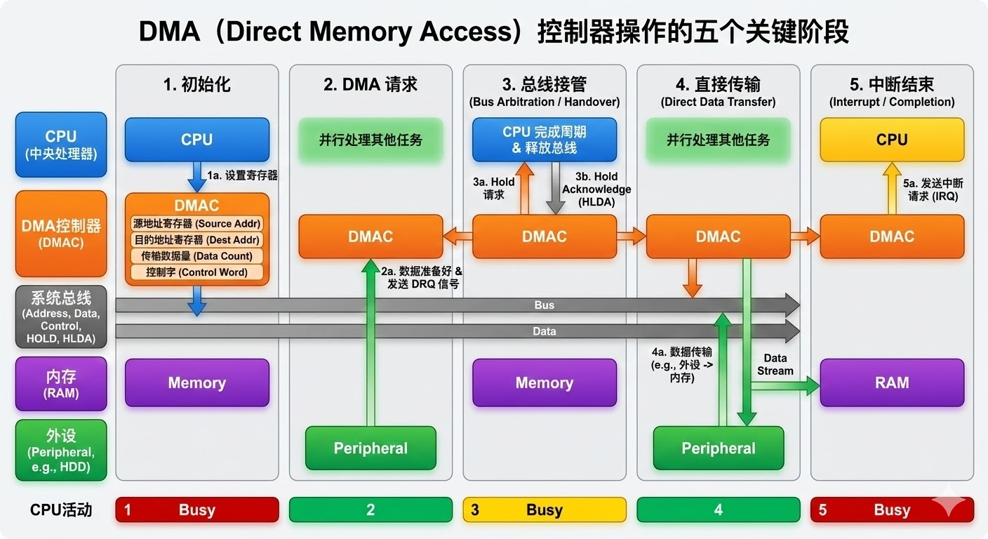 结束(Interrupt): 传输完成后,DMA 控制器向 CPU 发起中断,告知"活儿干完了"。