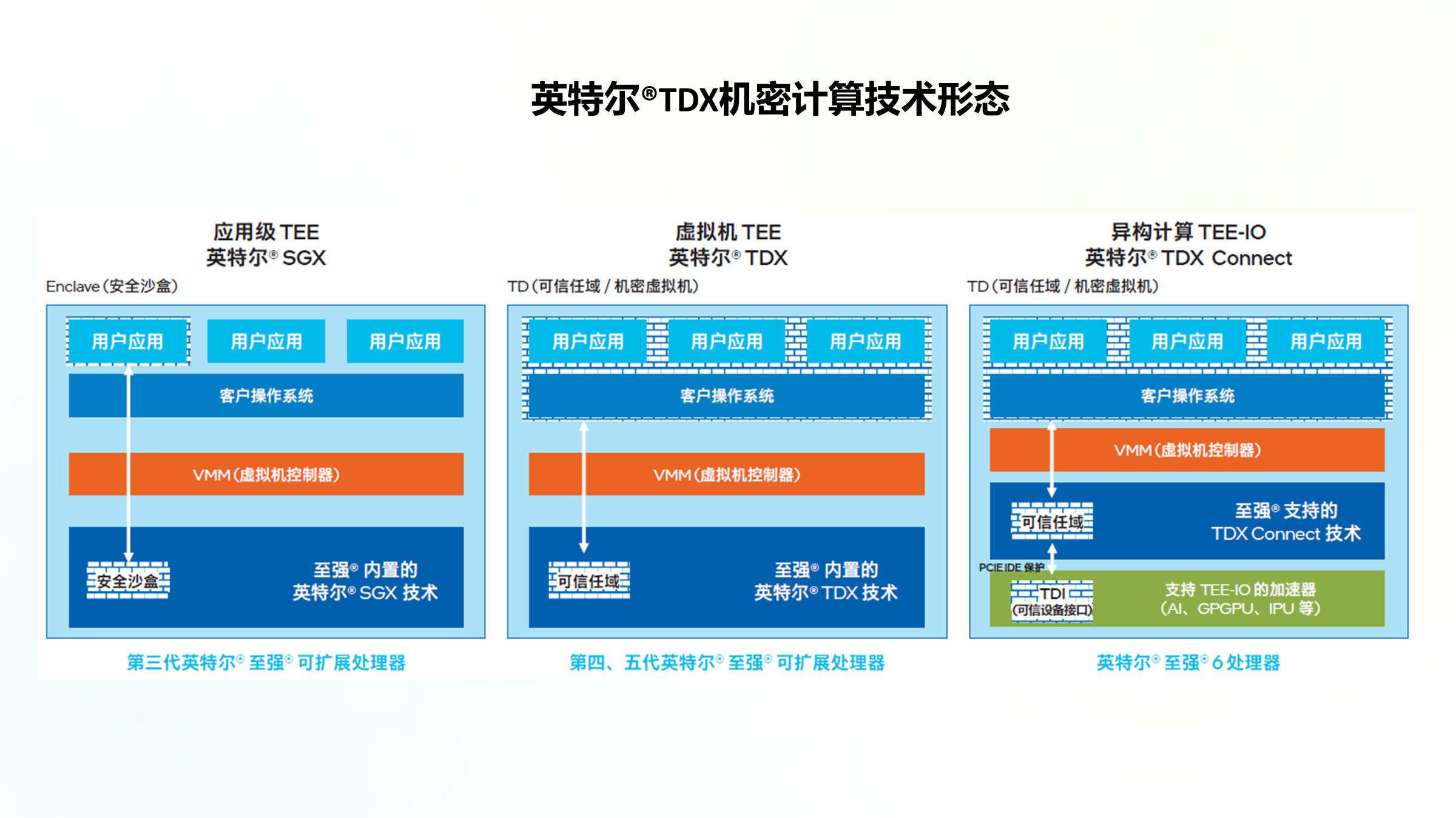 英特尔®TDX 为企业提供基于机密虚拟机、机密 GPU 实例和机密容器的可信算力保障,满足计算、存储及异构加速等基础算力需求。它能够在多租户环境下实现用户数据处理的强隔离,保护 AI 推理与训练的全流程数据安全,借助其灵活的可信度量和证明机制,同时支撑可验证、可审计的可信算力体系构建。TDX 提供的可信度量不仅是启动安全的基础,更是远程认证(Remote Attestation)和运行时可信评估的前提条件。
