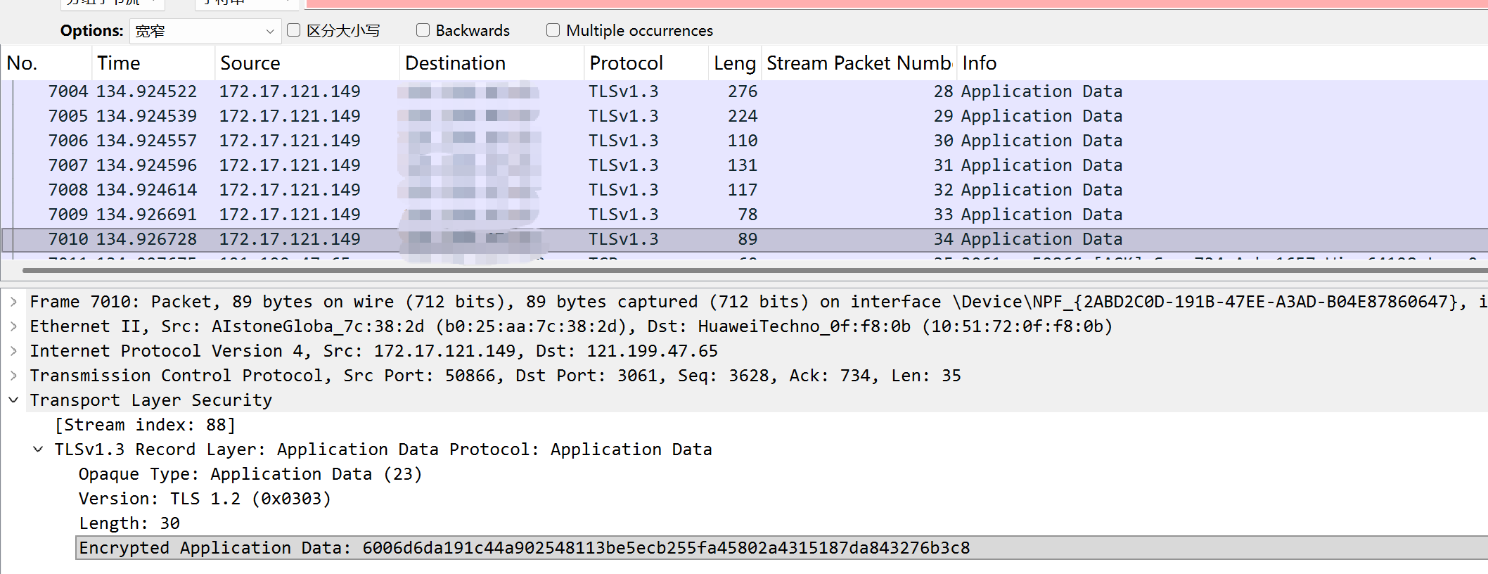 六、在wirrshark中对流量进行分析,发现数据被加密