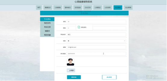 游客只能做一些简单的操作,看看首页的辅导医生、在线视频、论坛交流、心理测试、公告信息,当你成为学生后,进行注册、登录,学号、密码都正确的时候就可以成功登录,此时进入页面,可以修改个人信息等操作。