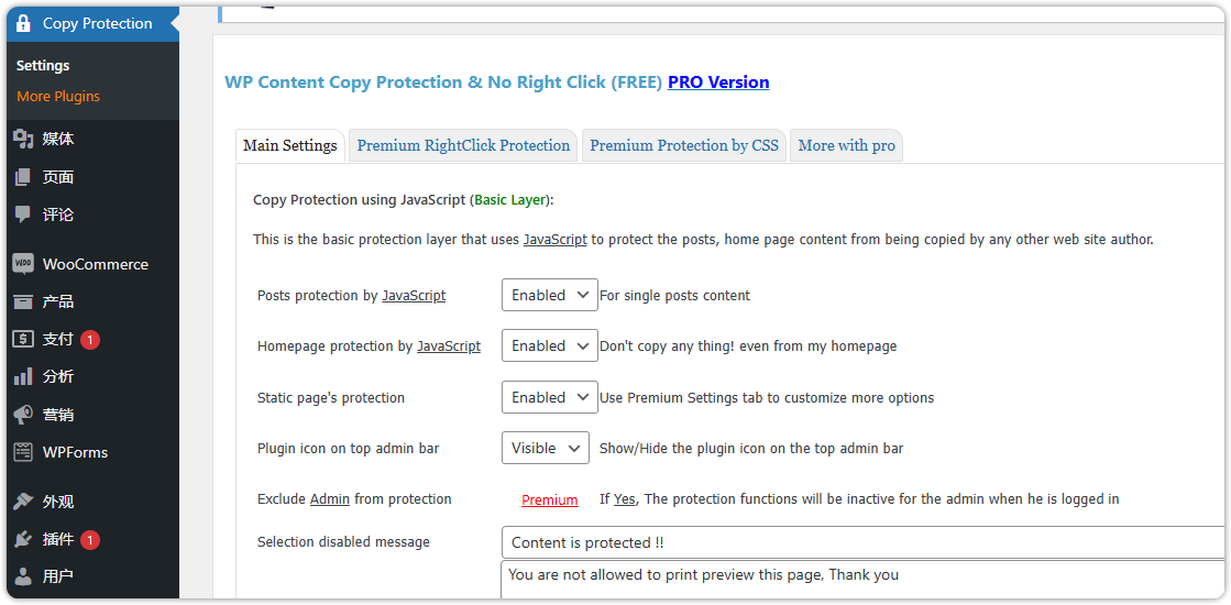 在 WordPress 后台找到 "内容保护"(Copy Protection)菜单。