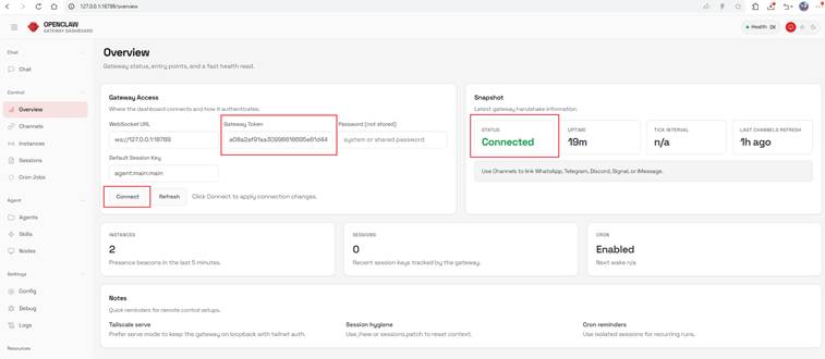 将token配置到overview的Gateway Token项中, 点击Connect按钮, 如果Snapshot显示Connected, 则表示配置成功.