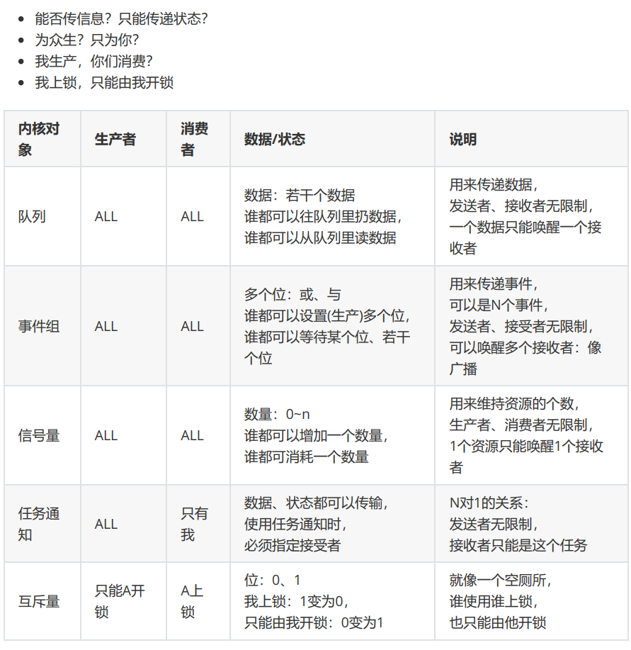 - 任务、ISR都可以放入数据;任务、ISR都可以从中读出数据