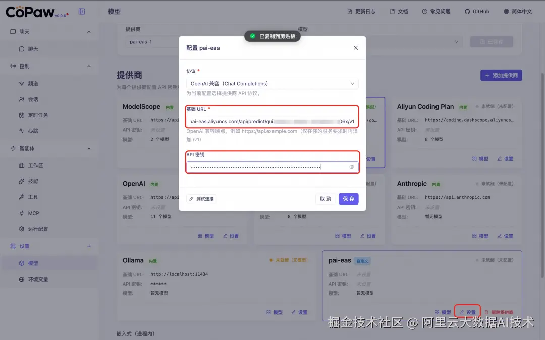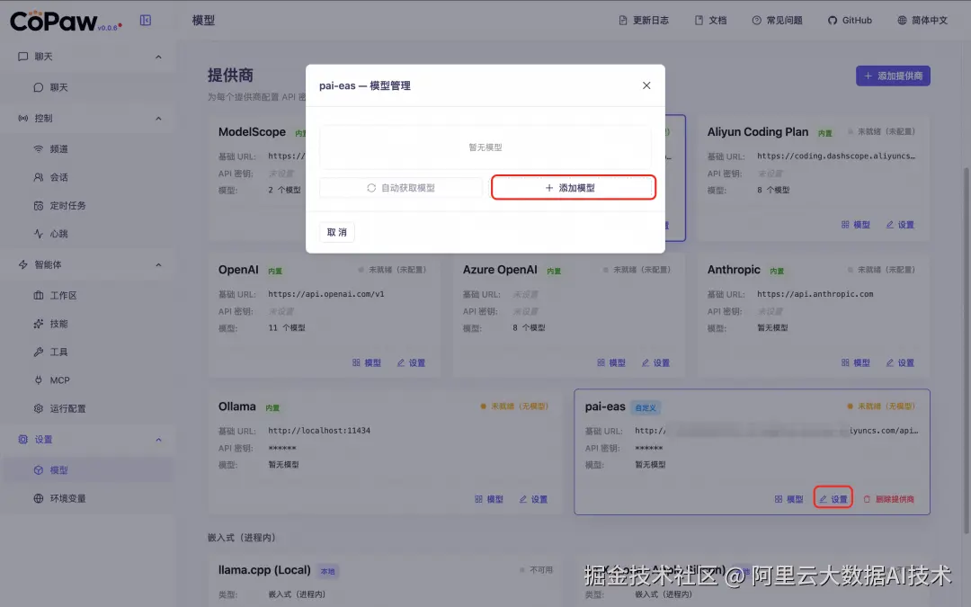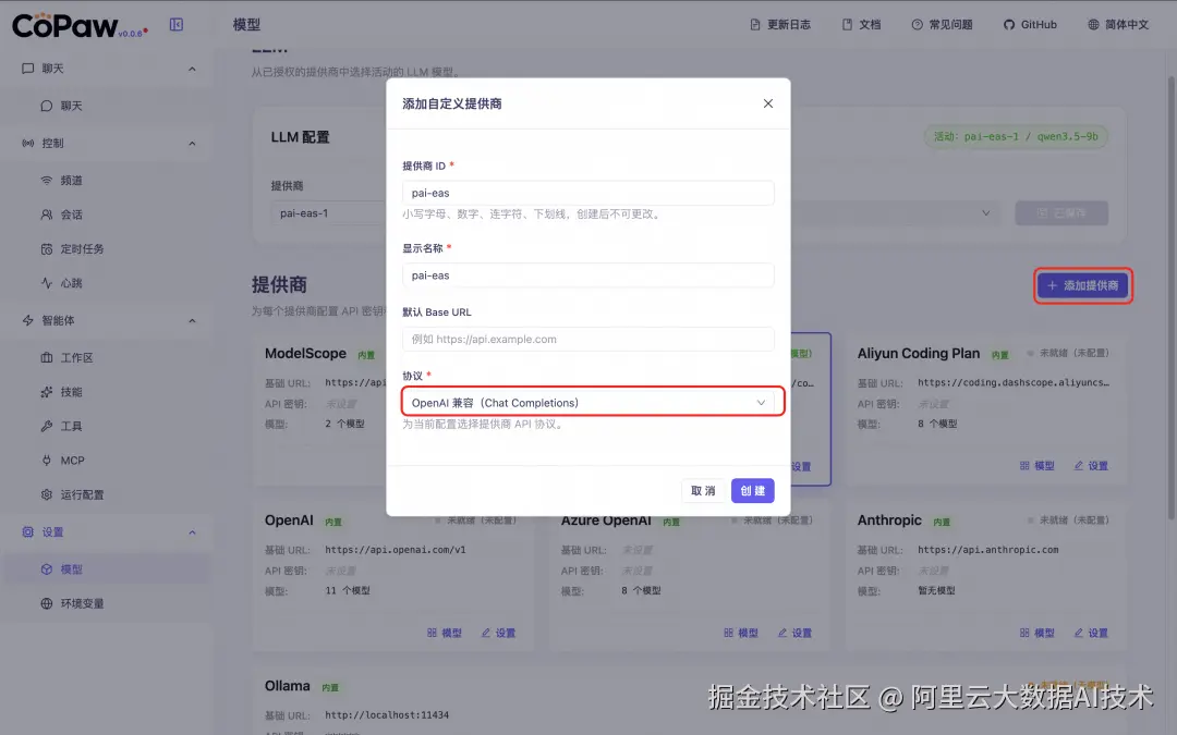 c. 单击添加提供商,添加 PAI-EAS 为新的提供商,协议选择 OpenAI 兼容。