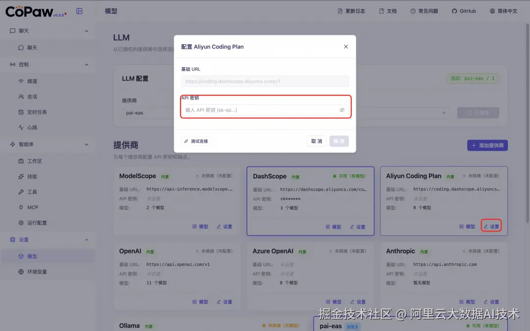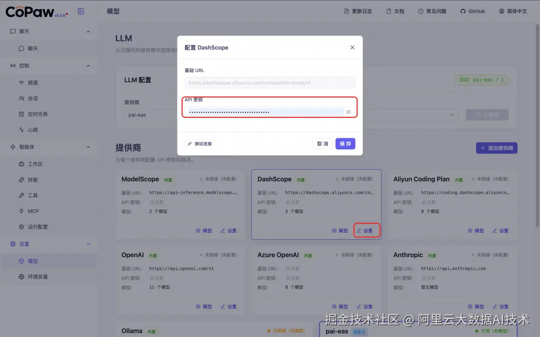 2.3 DashScope 单击 DashScope 提供商卡片上的设置,添加 阿里云百炼 API Key,参见 模型列表添加更多模型。