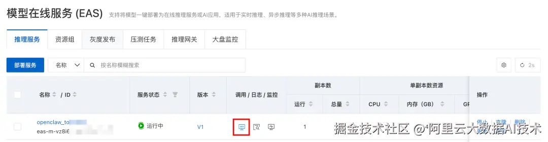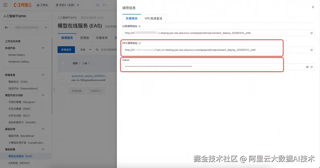 b. 服务部署完成后,可以在 PAI-EAS 控制台查看调用地址和 token。