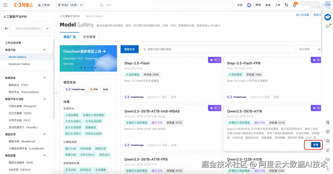 a. 进入 Model Gallery 控制台,选择您想要部署的模型,例如:Qwen3.5-397B-A17B。