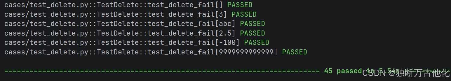 - 通过率:45个测试用例全部通过,100%的通过率表示所有测试用例均成功执行,无失败用例。通过率是衡量接口质量和测试效果的关键指标,测试环境中通过率应达到95%以上。