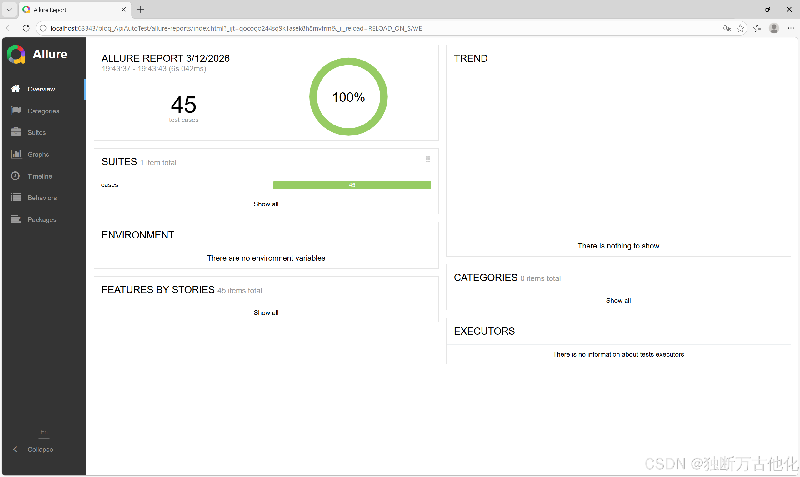 通过allure 的命令生成测试结果和测试报告,可以启动本地服务器实时查看报告,也可以生成静态的html文件,具体操作可查看该文:【测试结果可视化:Allure 在 Python 接口自动化中的应用】