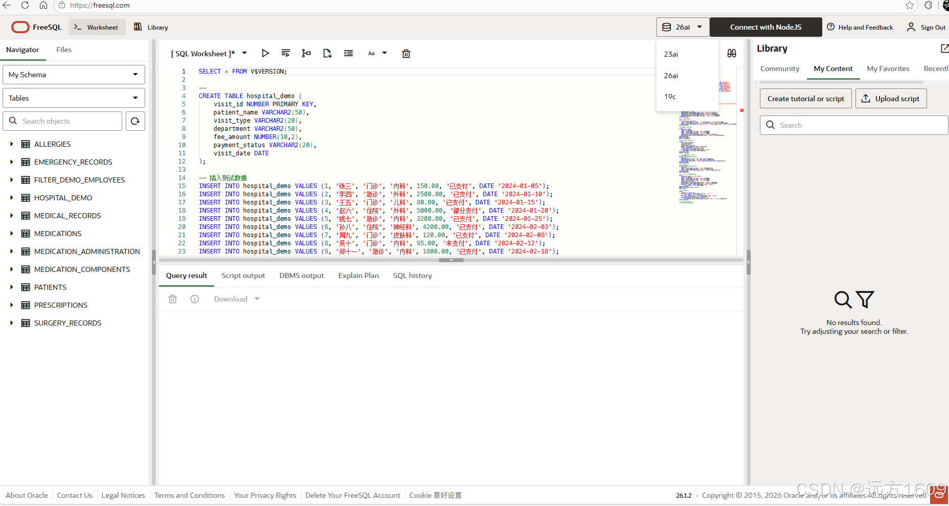 FreeSQL( https://freesql.com)作为一款专为 Oracle 开发者打造的在线 SQL 环境,以 零成本、全版本兼容、一键切换、易分享为核心特点,彻底解决了本地搭建多版本 Oracle 环境的痛点。无论是 Oracle 19c 经典特性验证、23ai 新增功能测试,还是 26ai AI 原生特性的探索,都能在 FreeSQL 中实现高效、精准的操作,且验证通过的脚本可直接落地生产。