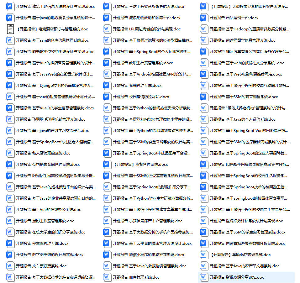 以上是某同学的毕业设计答辩的过程,如果你现在还没有参加答辩,还是开题阶段,已经选好了题目不知道怎么写开题报告,可以下面找找有没有自己符合自己题目的开题报告内容,列表中的开题报告都是往届真实的开题报告,可发送使用或参考。文末或底部来联xi可免费获取
