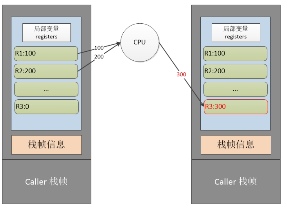 其实"寄存器"的概念只是当前栈帧中一块连续的内存区域。这些数据在运算的时候,直接送入物理CPU进行计算,无需再传送到operand stack上然后再进行运算。例如"ADD R3, R2, R1"的示意图就如下所示: