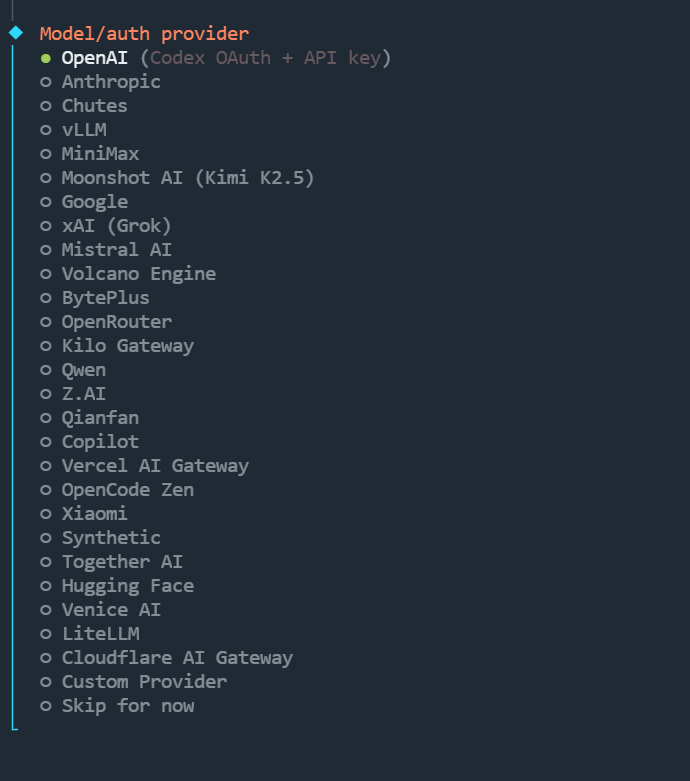 选择通讯渠道(这边直接skip for now,获取可以通过openclaw channels add来添加)