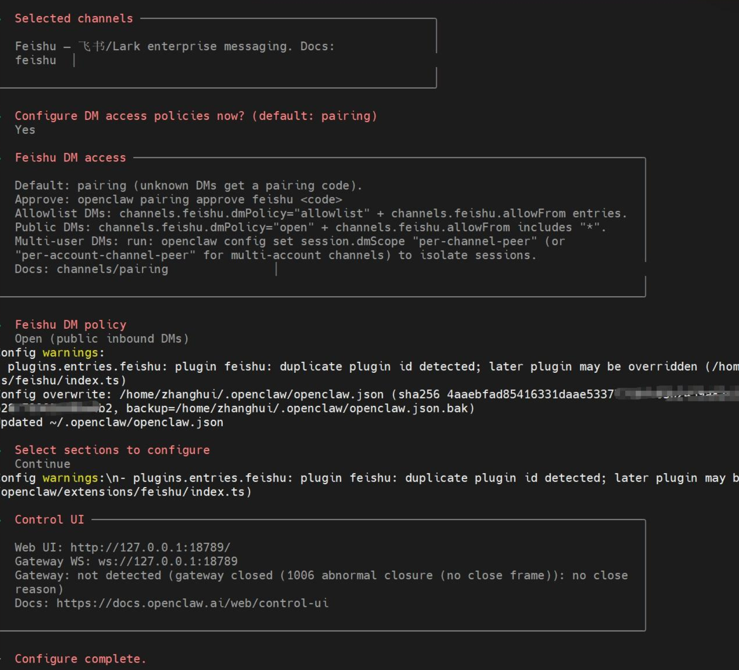 这一步可能在配置长连接接受事件可能会报错,没事,因为下面的openclaw飞书插件还没有配置。